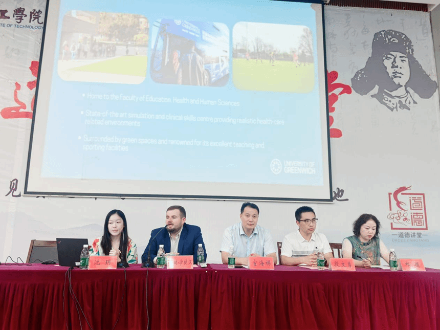 康纳·沙纳汉与国合处对外交流科副科长刘奕分别介绍了英国格林威治大学、美国底特律大学的办学历史、人才培养模式、入读条件等情况。我校2025届毕业生代表、即将攻读英国南安普顿大学硕士的李齐和即将攻读英国华威大学硕士的瞿薇佳,分别介绍了在盐工以及国外的学习和生活感悟,鼓舞和激励学弟学妹充分利用中外合作办学平台提供的优质教育资源,并努力朝着既定的目标奋力前行。