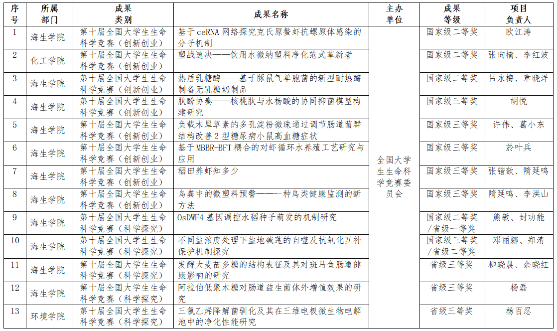 近日,第十届全国大学生生命科学竞赛系列赛事(科学探究类、创新创业类)全国总决赛圆满落幕。我校学子表现优异,经过激烈角逐,来自海洋与生物工程学院、化学化工学院和环境科学与工程学院学子共获得国家级二等奖4项、国家级三等奖6项、省级三等奖3项,奖项涵盖科学探究和创新创业两个赛道。