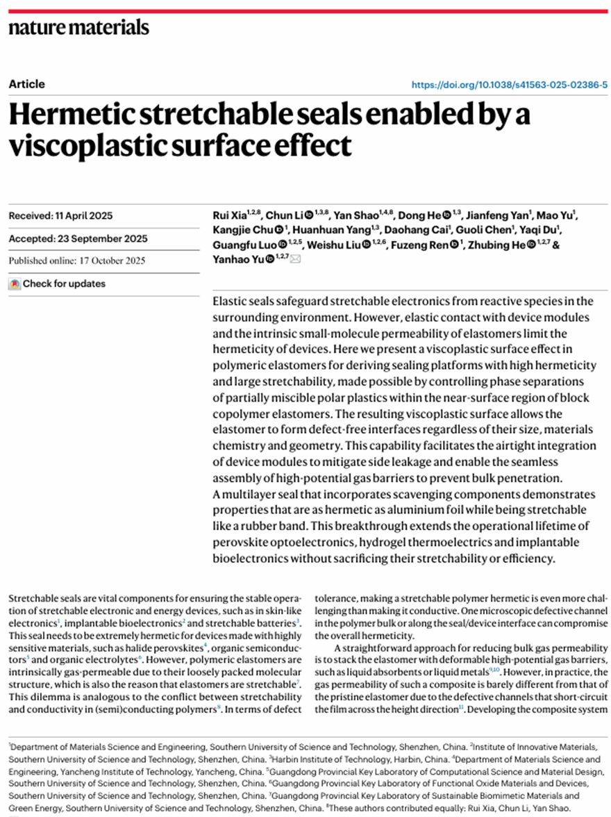 近日,材料学院邵艳博士与南方科技大学于严淏副教授团队合作在柔性电子封装研究中取得进展,相关成果以标题“Hermetic Stretchable Seals Enabled by a Viscoplastic Surface Effect”发表在Nature Materials期刊。邵艳博士为共同第一作者,盐城工学院为共同完成单位,该工作得到了国家自然科学基金项目以及盐城工学院高层次人才科研启动项目的资助。