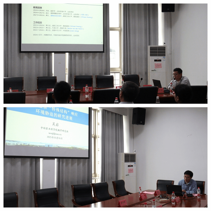 学术交流环节,宋士健博士作了题为《植物源绿色疫苗及其纳米佐剂递送平台的研究》的报告,以新冠病毒为例,利用烟草为生物反应器进行分子设计、蛋白诱导和高效纯化,进而生产优异的绿色疫苗;吴启博士汇报了《植物根系特殊结构响应环境胁迫的研究进展》,以拟南芥根系为研究对象,探索环境胁迫下钾元素吸收和转运的调控机制。