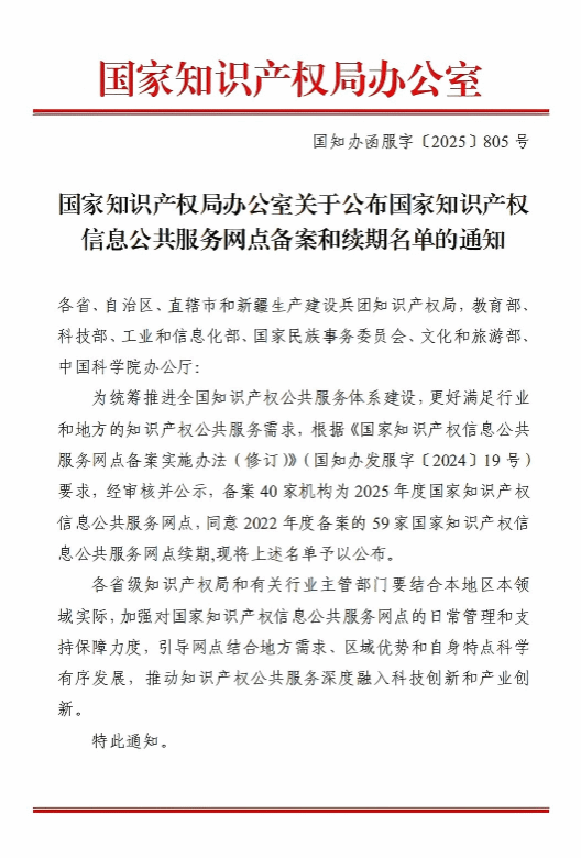 近日,国家知识产权局办公室印发《关于公布国家知识产权信息公共服务网点备案和续期名单的通知》(国知办函服字〔2025〕805号),我校顺利通过国家知识产权信息公共服务网点三年建设期考核。