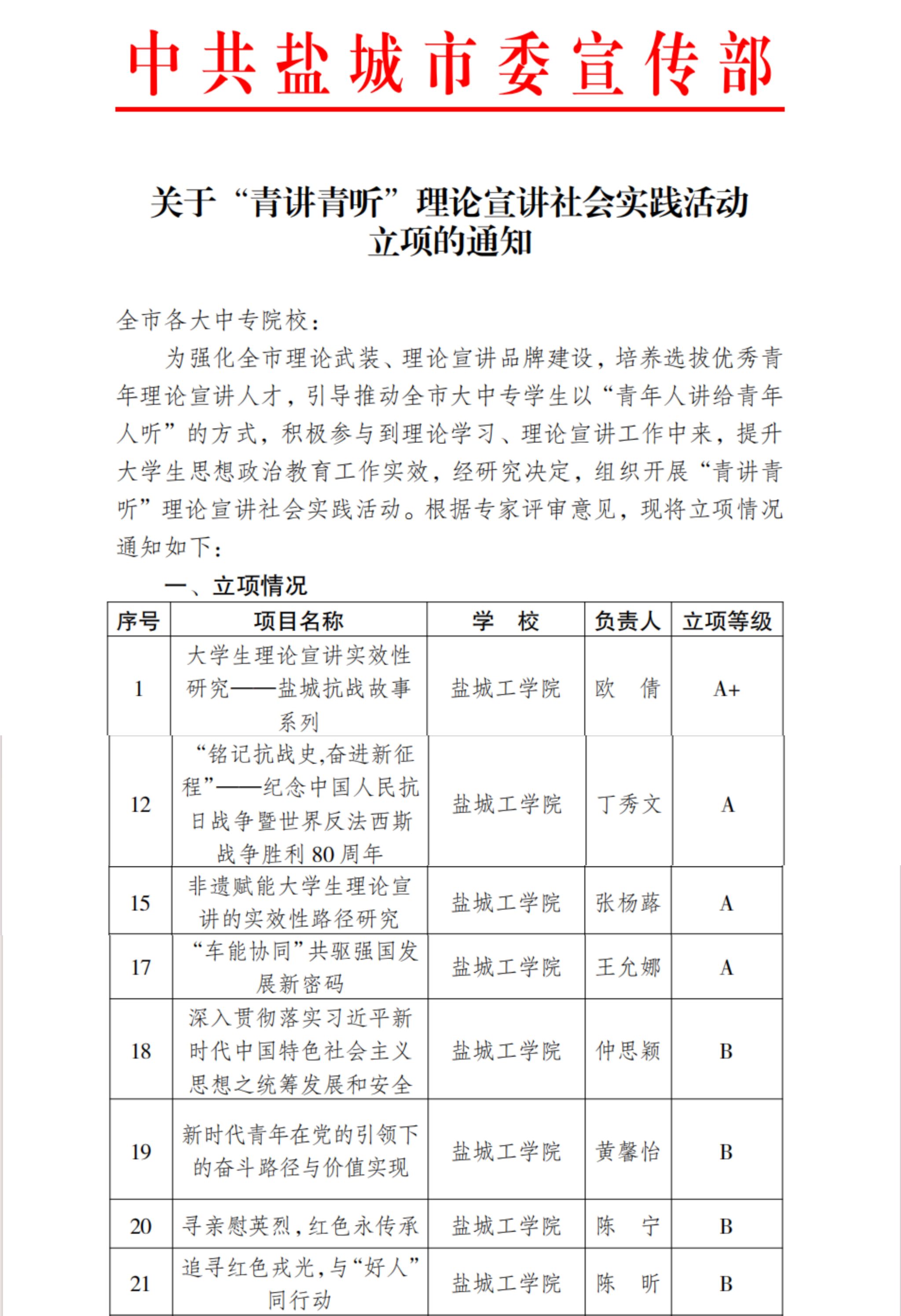 据悉,本次“青讲青听”理论宣讲社会实践活动,是盐城工学院网络思政中心2025年度大学生理论宣讲系列活动的重要组成部分。活动旨在进一步加强学校理论宣讲品牌建设,挖掘和培养一批政治素养高、表达能力强的优秀青年理论宣讲人才,推动党的创新理论在青年群体中落地生根。活动共收到11个项目立项申请,经层层审核与推荐,其中8个项目成功获得盐城市委宣传部立项(共22项),充分展现了学校在青年理论宣讲工作中的扎实基础与突出优势。