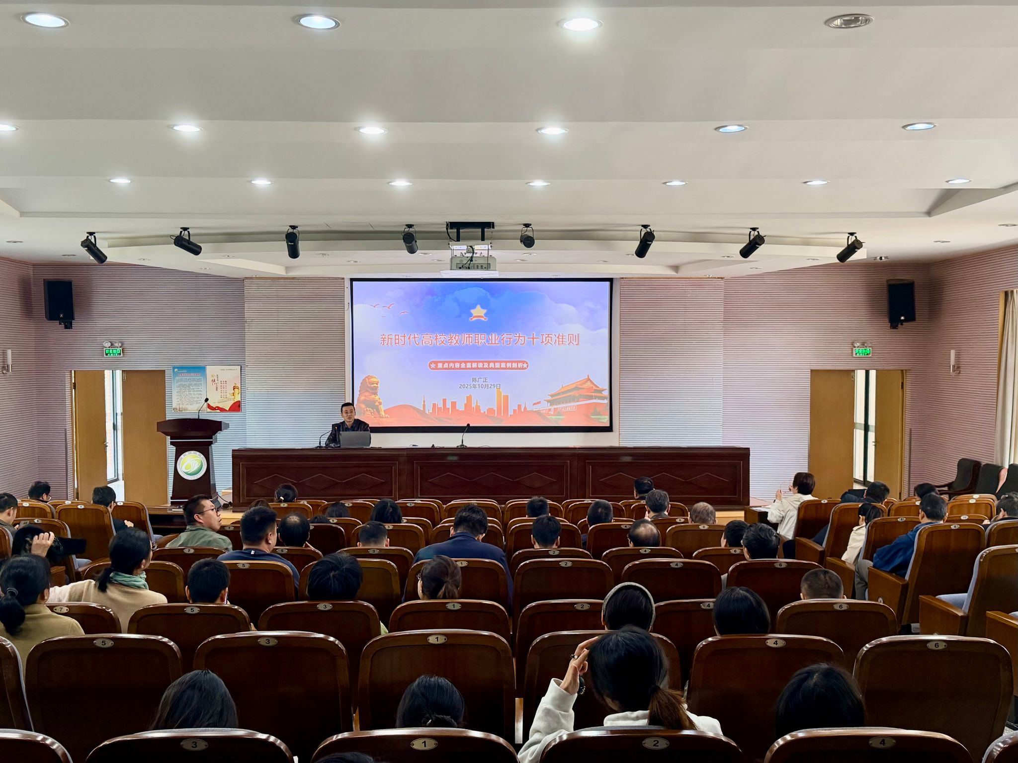 陈广正详细解读了《新时代高校教师职业行为十项准则》的精神要义,通报了近年来高教系统出现的一些违法违纪的典型案例,以案说法、以案说德,警示全体教师要严格遵守师德规范,加强师德修养,以案为鉴,做到警钟长鸣,弘扬正气。