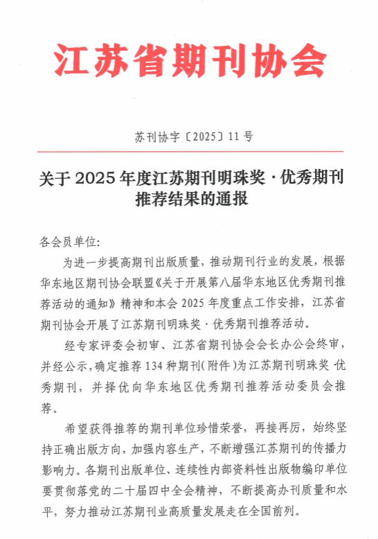 “江苏期刊明珠奖”是由江苏省期刊协会组织评选的重要期刊奖项,作为江苏省期刊界具备权威性与影响力的重磅奖项,其始终以提升期刊质量与核心竞争力为使命,树立行业标杆,为期刊出版行业的高质量发展注入强劲动能。
