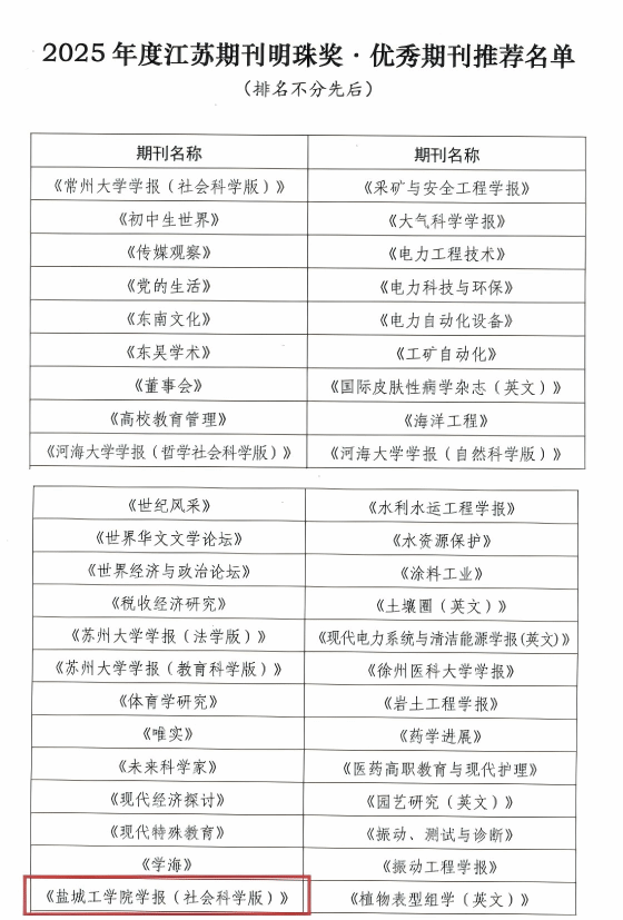近日, 2025年度江苏期刊明珠奖·优秀期刊推荐结果揭晓,我校《盐城工学院学报(社会科学版)》被评为“江苏期刊明珠奖·优秀期刊”。