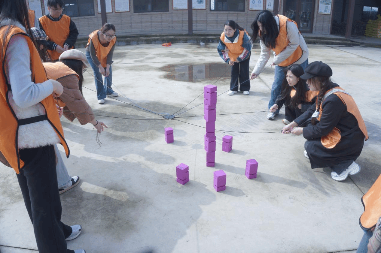 抵达首站老首乌生态园后,上午的活动正式拉开帷幕,通过设置“破冰+团队文化建设”环节,同学们打破隔阂,快速分组并推选队长,共同设计队名、队形、队徽与队歌,在互动中迅速建立信任。随后依次开展“合力筑塔”“极速60秒”“硕果累累”等三大主题项目。“合力筑塔”中,同学们拉紧绳头控制塔钩,统一指挥、分工协作完成模型搭建;“极速60秒”里,大家在规定时间内有序整理数字卡片,锻炼了沟通效率与全局观念;“硕果累累”项目通过竞猜水果的形式,进一步提升了团队应对挑战的能力。