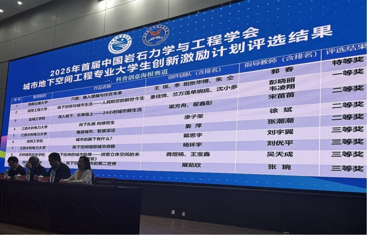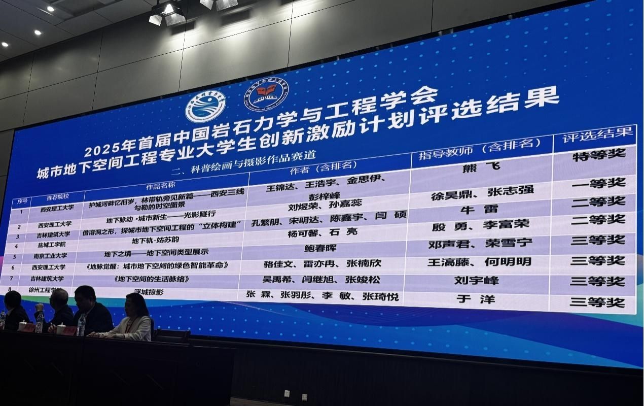 期间,开展了首届“中国岩石力学与工程学会城市地下空间工程专业大学生创新激励计划”评审与表彰工作。本届创作主题为“地下空间与城市生活”,主要目的是通过科普创意作品传播现代技术条件下城市地下空间开发对城市生活的创新性影响,推动城市地下空间的可持续利用与绿色智能创新,提升公众对城市地下空间的科学认知,促进城市地下空间领域的健康发展。我校李富荣、殷勇、宋苗苗作为指导教师,梁方舟、翟鑫彭、杨可馨、石亮4名本科生组成的两支队伍,提交作品“地下轨-姑苏韵”“深入地下,乐享地上—24小时城市新生活”分别获得科普绘画和摄影作品赛道、科普创意海报赛道二等奖。