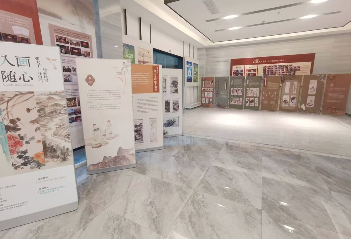活动现场,由盐城市博物馆精心筹备的《山河入画 笔墨随心——张大千·齐白石绘画特展》在产教融合大楼一楼大厅同步启幕。展览精选两位大师各时期的代表作近40件,包括张大千的《雁荡山观瀑图轴》《华山图轴》,齐白石的《虾蟹轴》《葫芦轴》等经典作品。此次展览持续至12月3日。