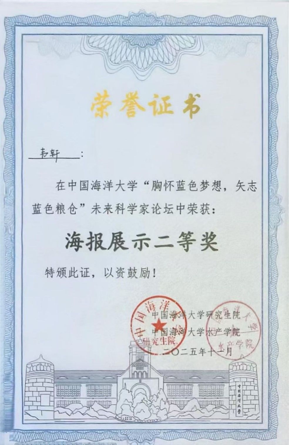 11月22日,中国海洋大学“胸怀蓝色梦想,矢志蓝色粮仓”未来科学家论坛在青岛顺利召开。海生学院生物与医药专业研究生韦轩(指导教师:齐志涛、潘明珠)、陈益豪(指导教师:隋延鸣)、杨佳楠(指导教师:张丽)在300多位报名者中脱颖而出,成功入围本次论坛。据悉,论坛共有58位同学入围。