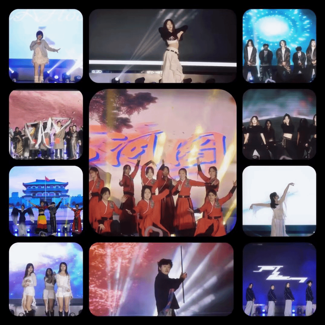 《Like a Flower》以轻盈舞步勾勒繁花绽放之姿,柔美韵律中尽显生命活力;《艾巴伽罗》融入浓郁民族风情,每一个动作都承载着地域文化的独特韵味;《龙腾盛世,共舞中华情》以舒展大气的身段演绎龙腾意象,将家国情怀融入翩跹舞姿;《Dreams Come True》踏着轻快节奏编织青春憧憬,跃动身影中满是追梦热忱;《Black Veil Bride》以黑纱为意象,用极具张力的表演营造出神秘冷艳的舞台氛围;《山河图》以大开大合的动作铺展山河盛景,身段流转间彰显华夏儿女的豪情壮志;《齐天烬》以“齐天大圣”为核心创作元素,凭借燃情演绎诠释不羁热血的悟空精神,实现国风韵味与舞台张力的完美融合;《镜》以精准同步的舞步构建镜像效应,折射出自我与世界的深层联结;《X-Sequence》以利落节奏拆解动作序列,动感节拍中迸发青春活力;《渔舟唱晚》以舒缓舞姿描摹渔舟归港之景,将黄昏时分的悠然意境展现得淋漓尽致;《Vibe It Up》则以热情节奏点燃全场,活力舞步让现场氛围持续升温。