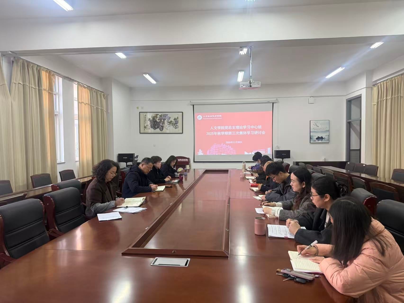11月26日下午,在仁和楼A304会议室,人文学院党总支理论学习中心组召开2025年秋学期第三次集体学习研讨会。会议由学院党总支书记何登溢主持,学院党总支理论学习中心组成员参加。