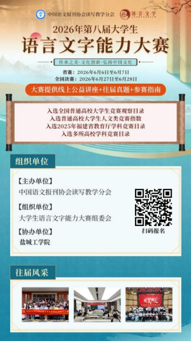 为深入贯彻落实《国家中长期教育改革和发展规划纲要》《中华人民共和国国家通用语言文字法》,测试大学生的语言文字知识和应用能力,弘扬中国文化,增强大学生规范使用国家通用语言文字的意识,促进语言文字教、学、测协调发展,在国家语委咨询委员等大赛专家顾问的指导下,中国语文报刊协会读写教学分会继续面向全国大学生举办“2026年第八届全国大学生语言文字能力大赛”,大赛每年一届,欢迎全国学子踊跃参加。