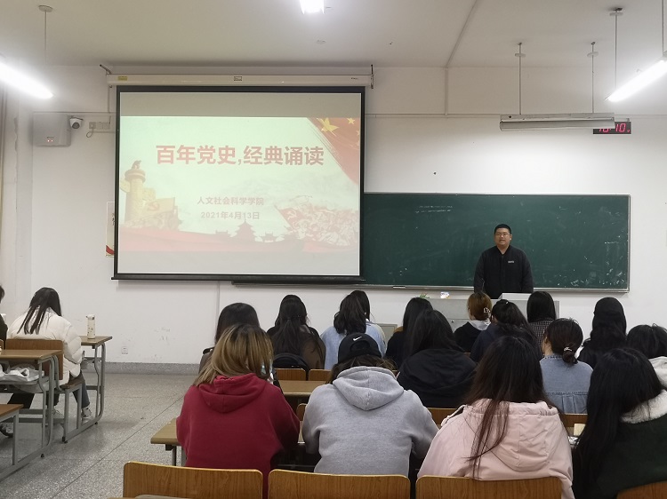 4月13日下午,在南校区博学楼B302教室,人文学院组织青年团员、党员发展对象开展“百年党史,经典诵读”党史学习教育。学院团委负责人主持。