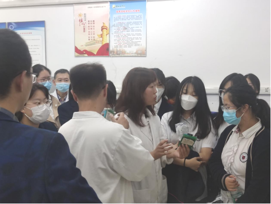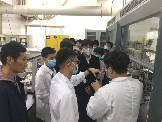 在光催化分解水制氢平台,董鹏玉博士为学生讲解了光催化分解水的基本原理,并现场展示了实验室自主合成的具有高效催化活性的纳米光催化剂,让同学们体会到纳米材料在环保和清洁能源领域的重要性。