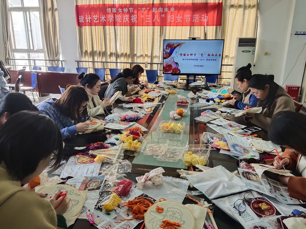 为庆祝“三八”国际劳动妇女节,丰富女教职工的业余文化生活,促进教职工身心健康发展,3月8日下午,在希望大道校区润美楼A201,设计艺术学院开展“情暖女神节‘艺’起向未来”女教职工戳戳绣活动。学院20余名女教职工欢聚在一起,亲自动手绣制了一幅幅精致美丽的作品,开心地度过了一个值得纪念的节日。学院党总支书记胡凌霞参加活动。