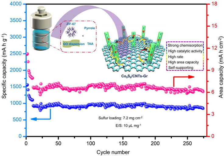 锂硫电池具有能量密度大,潜在成本低的优点广受关注。然而硫正极导电性差,以及由反应生成的可溶性多硫化物引起的“穿梭效应”严重限制了锂硫电池的实际应用。本文借助简便的可控热解法,设计制备了具有金属性的极性Co9S8纳米颗粒包裹在吡咯修饰的石墨烯纳米片上,同时在热气氛下Co9S8作为催化活性位点原位生长出碳纳米管。得益于Co9S8纳米颗粒高效的电催化活性,改性石墨烯和原位生长碳纳米管优异的电子传输特性,本工作制备得到的Co9S8/CNTs-Gr复合材料通过熔融法固硫后作为锂硫电池的正极材料显示了优异的电化学性能,在1C的电流密度下能保持950mAhg-1的高电容量,每圈的容量衰减率只有0.01%;并且在7.2mgcm-2的高硫担载量下,面积比容量能达到6mAhcm-2。