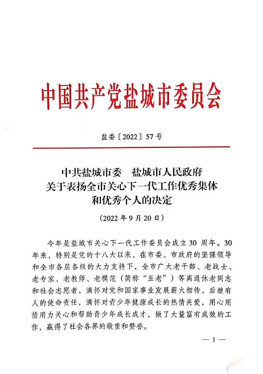 在9月22日召开的纪念盐城市关工委成立30周年纪念会上,我校关工委荣获市“关心下一代工作优秀集体”荣誉称号,周瑞明同志荣获市“关心下一代工作优秀个人”荣誉称号。