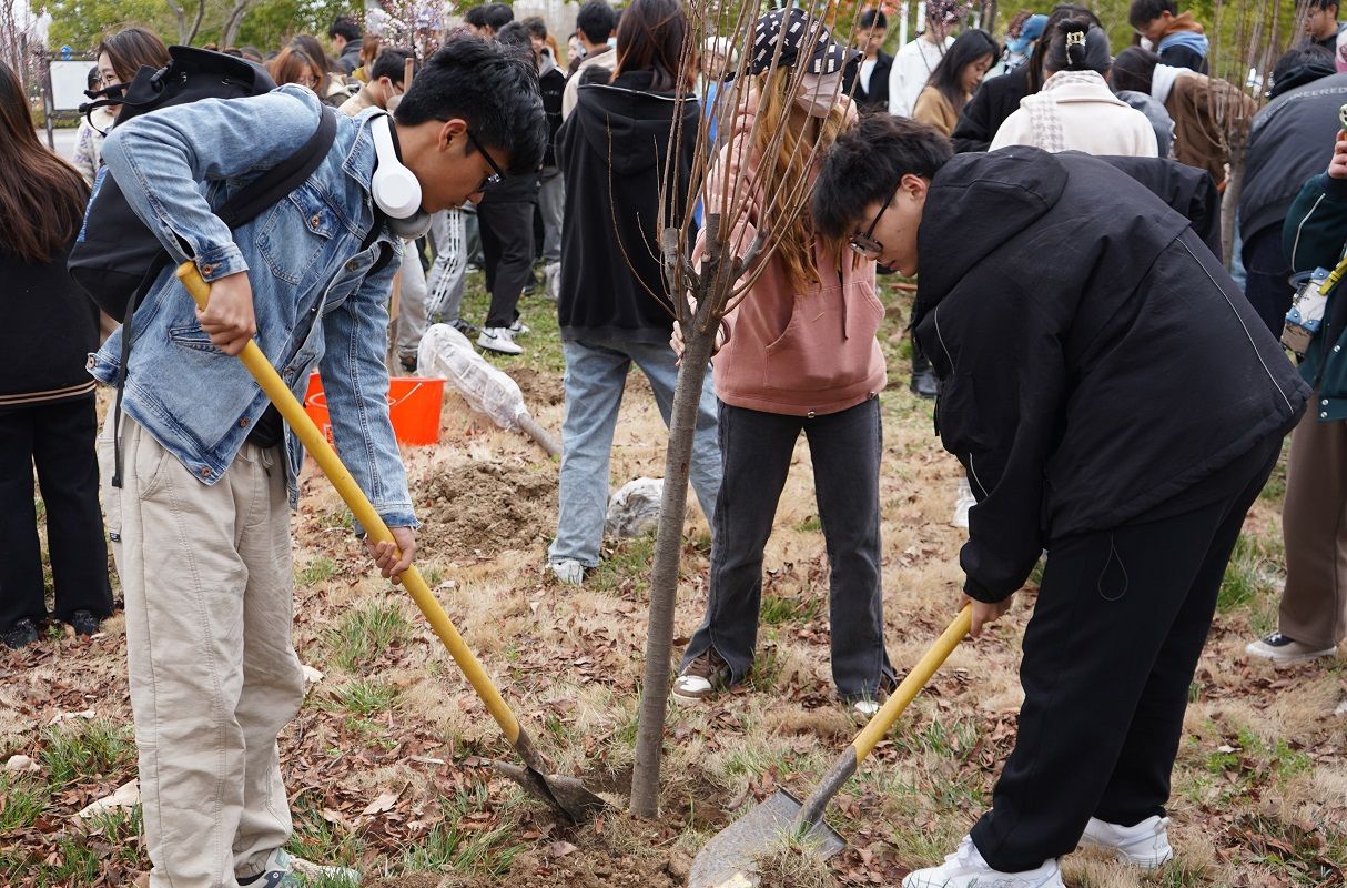 植树活动现场,校后勤服务集团为同学们提供了铁铲、水桶等植树工具,同学们在工作人员的指导下展开劳动。大家既有分工又有协作,严格按照流程认真细致地挥锹挖土、扶苗填坑、夯土浇水,充分发扬不怕苦、不怕累的精神,干劲十足,热情高涨。B服装222班的王佳雯表示,“一年之计在于春,亲手种一棵树,就是把自己的一片情意种在了这里”;B环艺221班的陈博林感叹道,“在大一我们一起种下树苗,等大四甚至毕业后,我们还可以在植树节相聚于此,我觉得这是个很有意义的活动”。随后,大家在栽种好的树苗前合影留念,并在润美楼前拍摄年级合照;部分大二学子也在活动当天前来看望去年种下的小树苗,并为其除草、浇水、施肥;还有一些班级开展特色团日活动,在树苗周围栽种多肉植物。