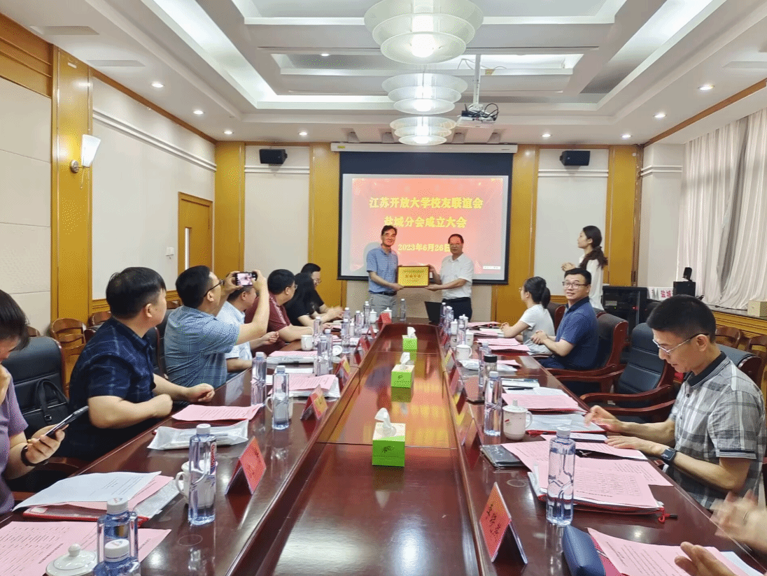 尤佳春为江苏开放大学校友联谊会盐城分会授牌,并分别为盐城分会会长、秘书长颁发聘书。刘涛宣读《关于同意成立江苏开放大学校友联谊会盐城分会的批复》。钱亚芹汇报了大会筹备工作情况,大会通过了盐城分会第一届理事会成员名单和《江苏开放大学校友联谊会盐城分会章程》。