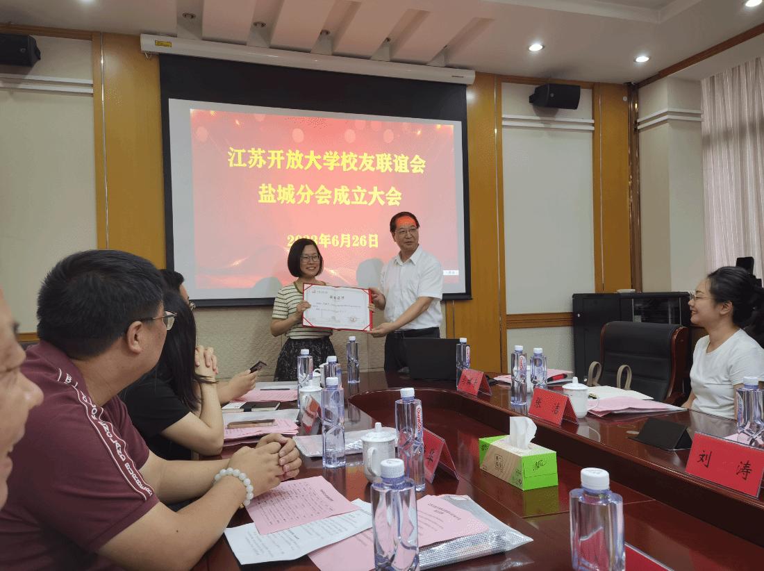 6月26日下午,江苏开放大学校友联谊会盐城分会在北校区图书馆301室正式成立。江苏开放大学党委常委、副校长尤佳春,学生工作处处长、校友联谊会办公室主任刘涛,艺术学院党总支副书记张洁等到会指导,我校工会副主席吴旭,继续学院院长、盐城开放大学校长陈志华,党政办公室主任钱亚芹及部分校友理事会代表参加会议。会议由继续教育学院副院长、盐城开放大学副校长李晓燕主持。