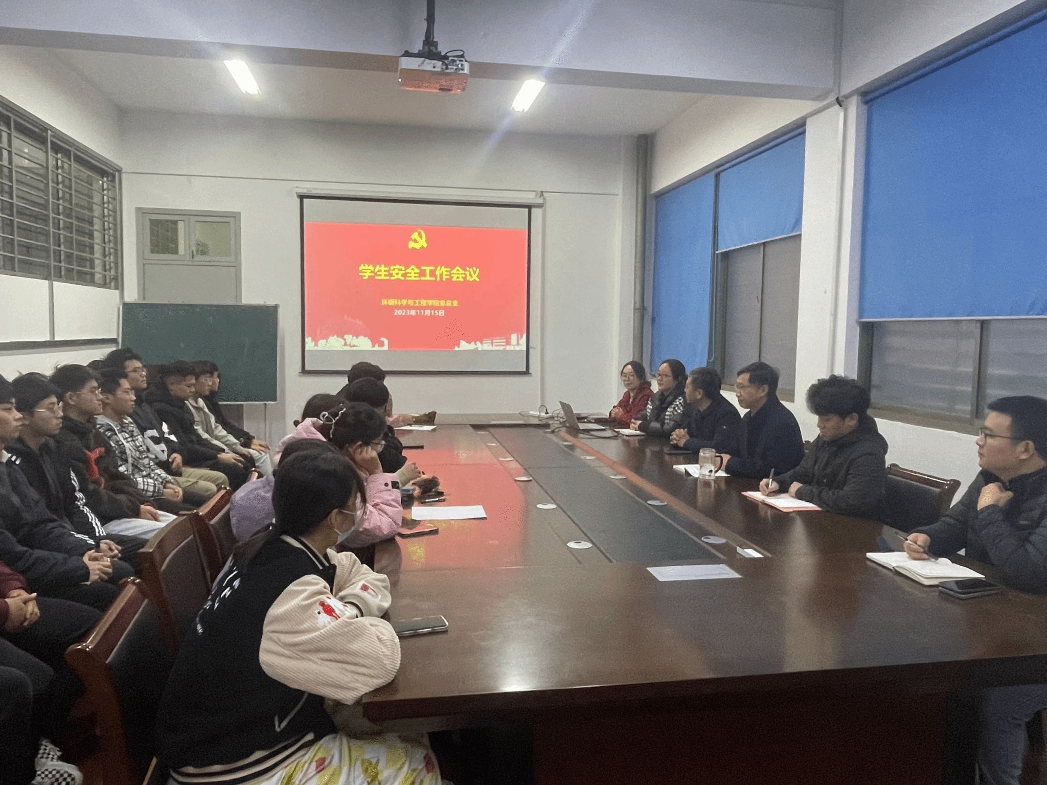 为进一步加强学生安全管理,筑牢校园安全防线,营造安全和谐校园环境,11月15日下午,环境学院在北校区学院会议室召开学生安全工作专题会议,学院党总支书记陈阳、全体专职辅导员及部分学生干部参加,会议由党总支副书记周政主持。