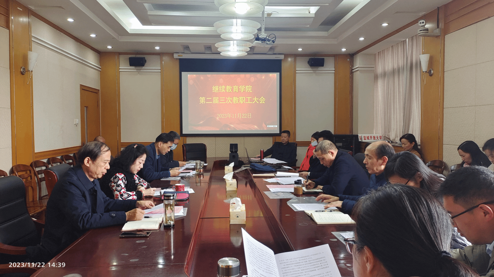 11月22日下午,盐城工学院继续教育学院(盐城开放大学) 在北校区图书馆301会议室召开第二届教职工大会第三次会议,学院党总支书记、院长陈志华作工作报告,副院长李晓燕主持会议。