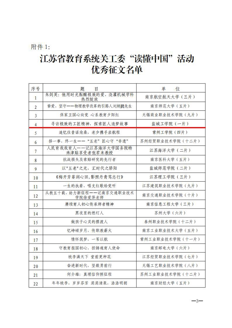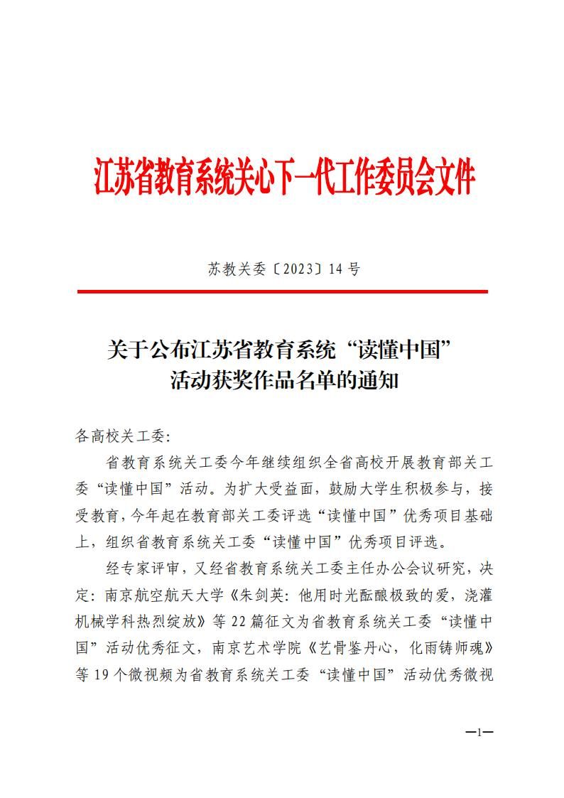 近日,江苏省教育系统关工委发布了《关于公布江苏省教育系统“读懂中国”活动获奖作品名单的通知》(苏教关委[2023]14号),我校设计艺术学院选送的《寻访极致的工匠精神,探索匠人追梦故事》文章获优秀征文奖。这是我校学生首次在此项活动中获奖。