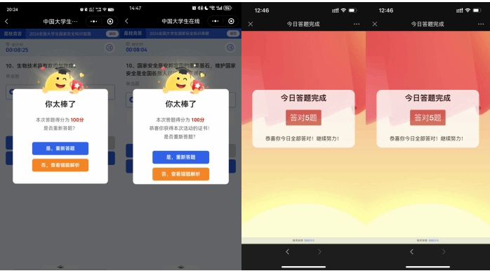 学院还组织师生积极参与“全民国家安全教育日专项答题”“全国大学生国家安全知识答题”活动,通过线上答题普及国家安全相关知识,促进师生将促进国家安全和社会稳定的思想贯穿到平时的学习、生活及活动中,自觉成为国家安全和社会稳定的自觉维护者。