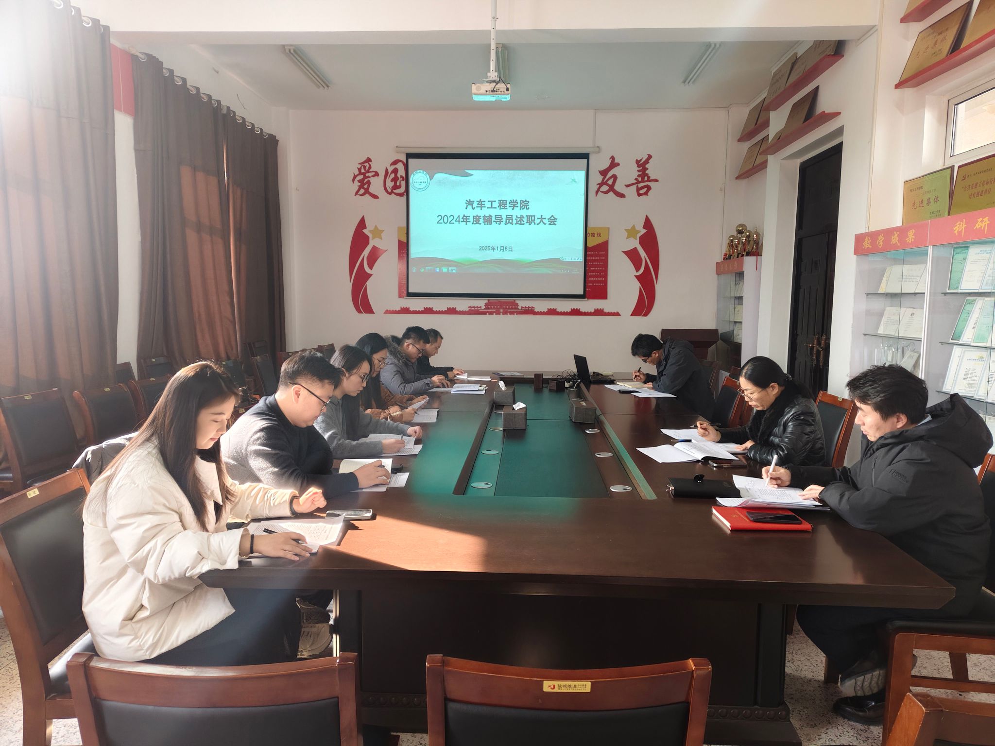 为回顾和总结2024年学生工作成绩,明确2025年学生工作发展目标和奋进方向,1月8日,汽车工程学院在机械馆323会议室召开2024年度辅导员述职会,学院党总支书记陈青、副院长郑竹安、党总支副书记丁德惠及全体辅导员参加会议。