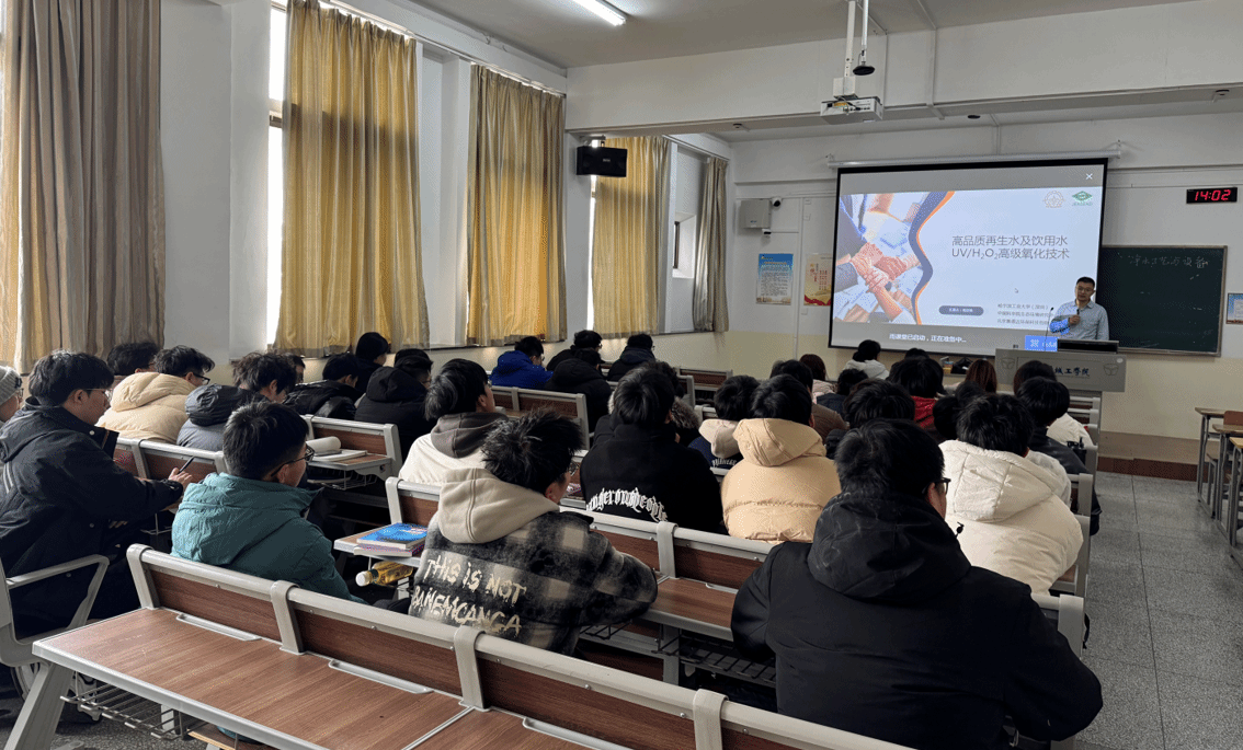 韩京龙教授在讲座中介绍了高品质再生水和饮用水处理的重要性及面临的挑战,详细阐述了UV/H2O2高级氧化技术的原理、优势及应用,并分享了在科研工作中的宝贵经验和成功案例。在讲座的过程中,同学们认真听讲,韩京龙教授围绕同学们感兴趣的内容耐心讲解,现场气氛热烈。同学们纷纷表示,通过此次讲座,不仅加深了对高品质再生水和饮用水处理技术的理解,还激发了对环境保护和水处理技术研究的兴趣。