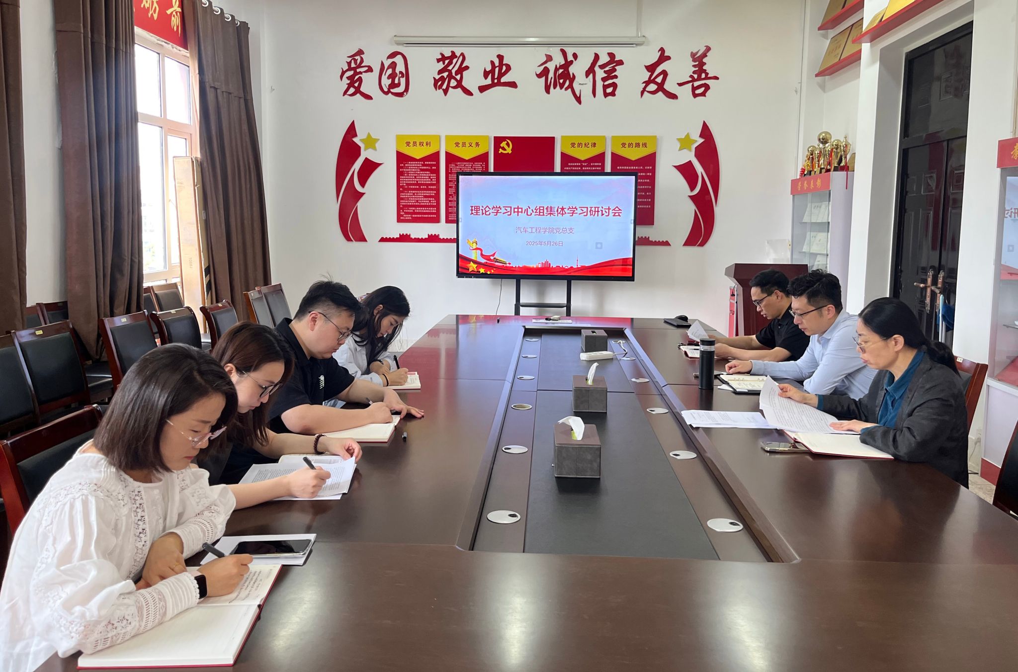 5月26日上午,汽车工程学院党总支理论学习中心组在机械馆A323会议室召开2025年春学期第四次集体学习研讨会,学习研讨《党的十八大以来深入贯彻中央八项规定精神的成效和经验》《习近平总书记关于党的建设的重要思想概论》《以中国式现代化全面推进强国建设、民族复兴伟业》《中共中央国务院关于弘扬教育家精神加强新时代高素质专业化教师队伍建设的意见》《习近平法治思想学习纲要》。汽车工程学院党总支书记陈青主持,汽车工程学院党总支理论学习中心组成员参加。