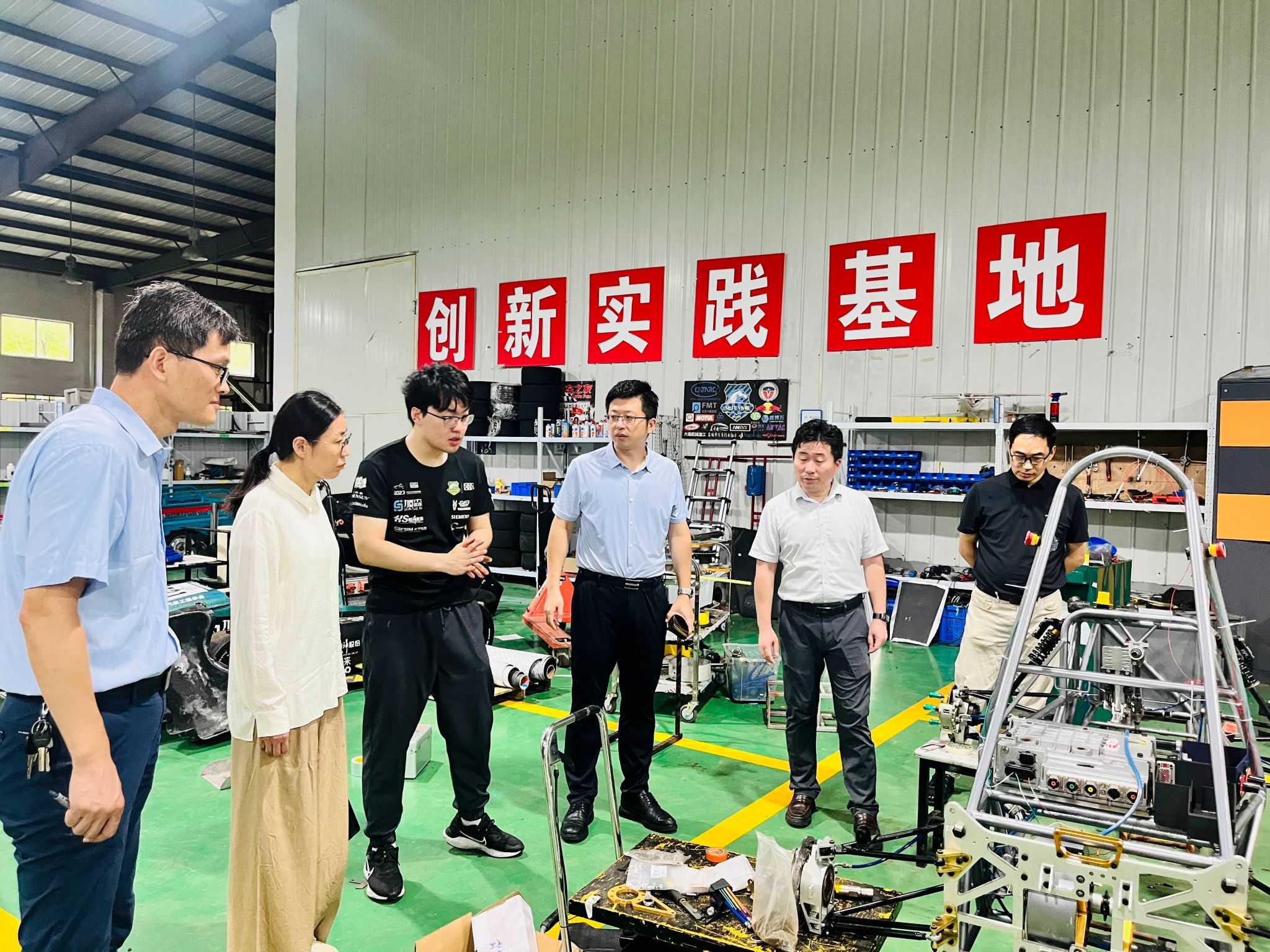 座谈会后,学院领导班子成员走访慰问了备战中国大学生方程式汽车大赛的野马车队队员。在车队工作室,院领导详细了解了赛车设计、制造及测试进展,对队员们的专业能力和团队精神表示赞赏。刘玮指出,野马车队是学院创新创业教育的重要平台,希望队员们发扬工匠精神,在赛事中再创佳绩,同时叮嘱大家做好防暑降温与安全保障工作。车队成员表示,将不负期望,以最佳状态迎接比赛,为学院争光。