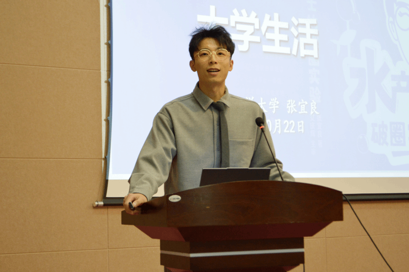 张宜良博士以《如何丰富自己的大学生活》为题,从“养不出母鱼就无法毕业”事件为切入点,回顾自己11年求学科研历程,分享从实验失败到技术突破的困境,以及通过新媒体推动专业“破圈”的经历。他认为大学生活要“比一比---找到差异,发扬光大”、要“多走一走--利用差异,走进旷野”、要“多看一看---看见机会,牢牢把握”、要“多试一试---试出惊喜,拥抱变化”。