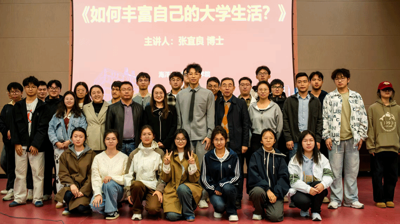 “我正是靠‘科研+传播’的组合,走出了不一样的路,相信你们也一定能走出属于自己的路。”张宜良博士分析了中国海洋大学校训“海纳百川,取则行远”的内涵,认为大学生要深耕专业,提高对专业的自信和认同,要打破舒适圈,不断奋斗。他强调新时代青年也要有跨界思维和公众表达能力,鼓励青年学子在大学阶段“夯实专业基础”与“培养跨界能力”间找到平衡,比如将专业知识与新媒体、数据分析结合,打造核心竞争力;面对“内卷”,要避免盲目比较,学会放大自身差异点,适时走差异化发展道路。