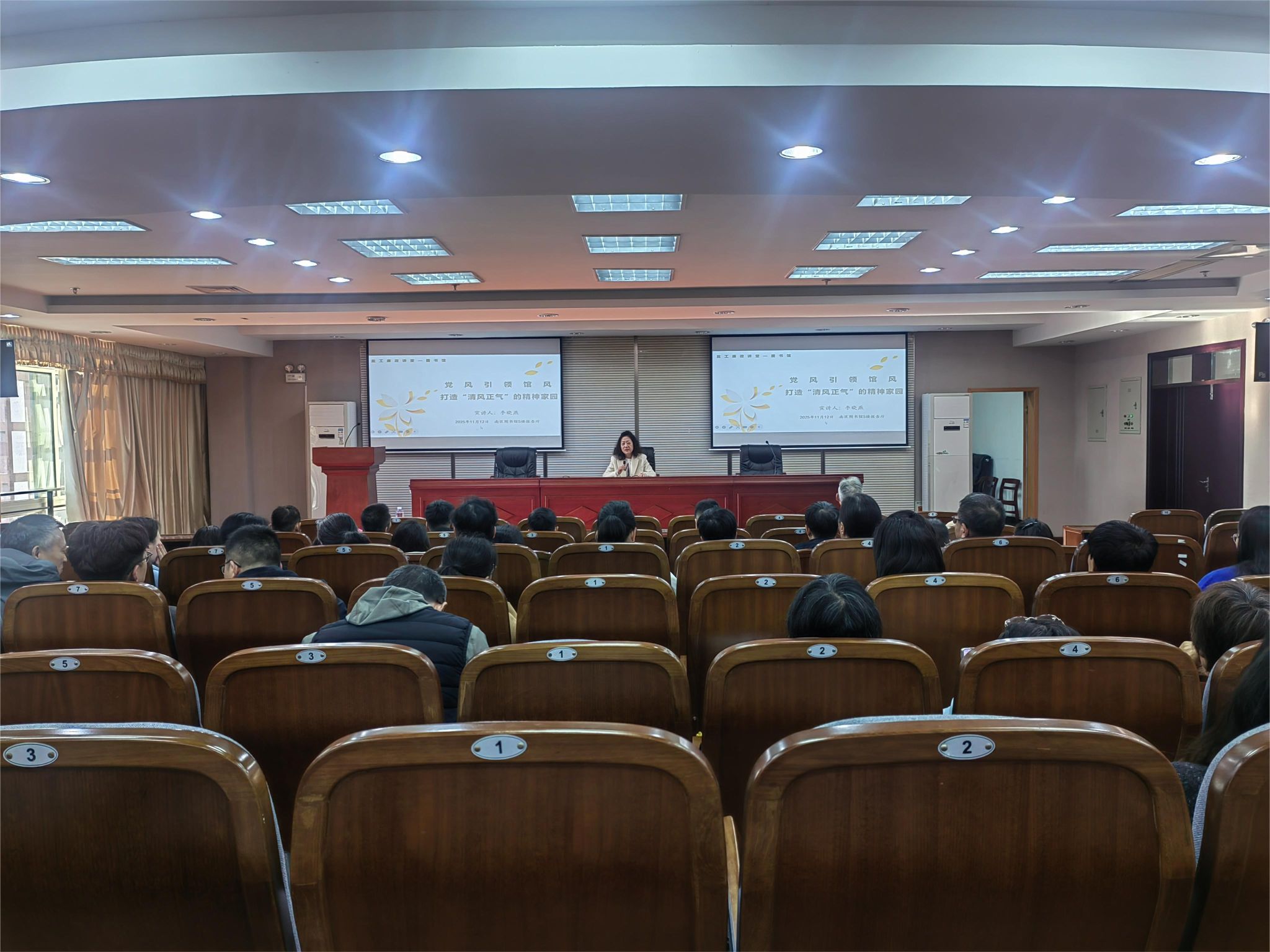 为深入推进党风廉政建设,强化教职工廉洁自律意识,筑牢思想防线,11月12日下午,图书馆党总支在南校区图书馆五楼报告厅开展廉政讲堂学习教育,党总支纪检委员、副馆长李晓燕主讲,全体教职工参加。